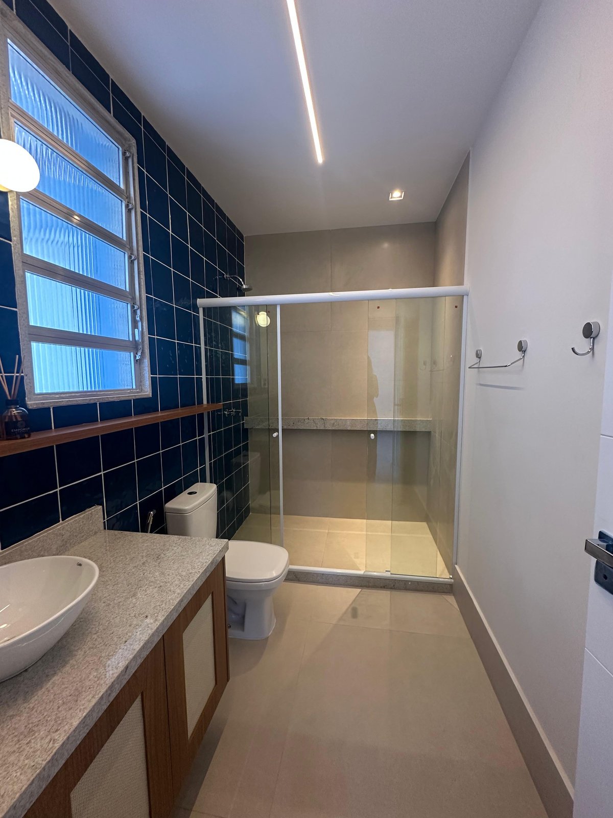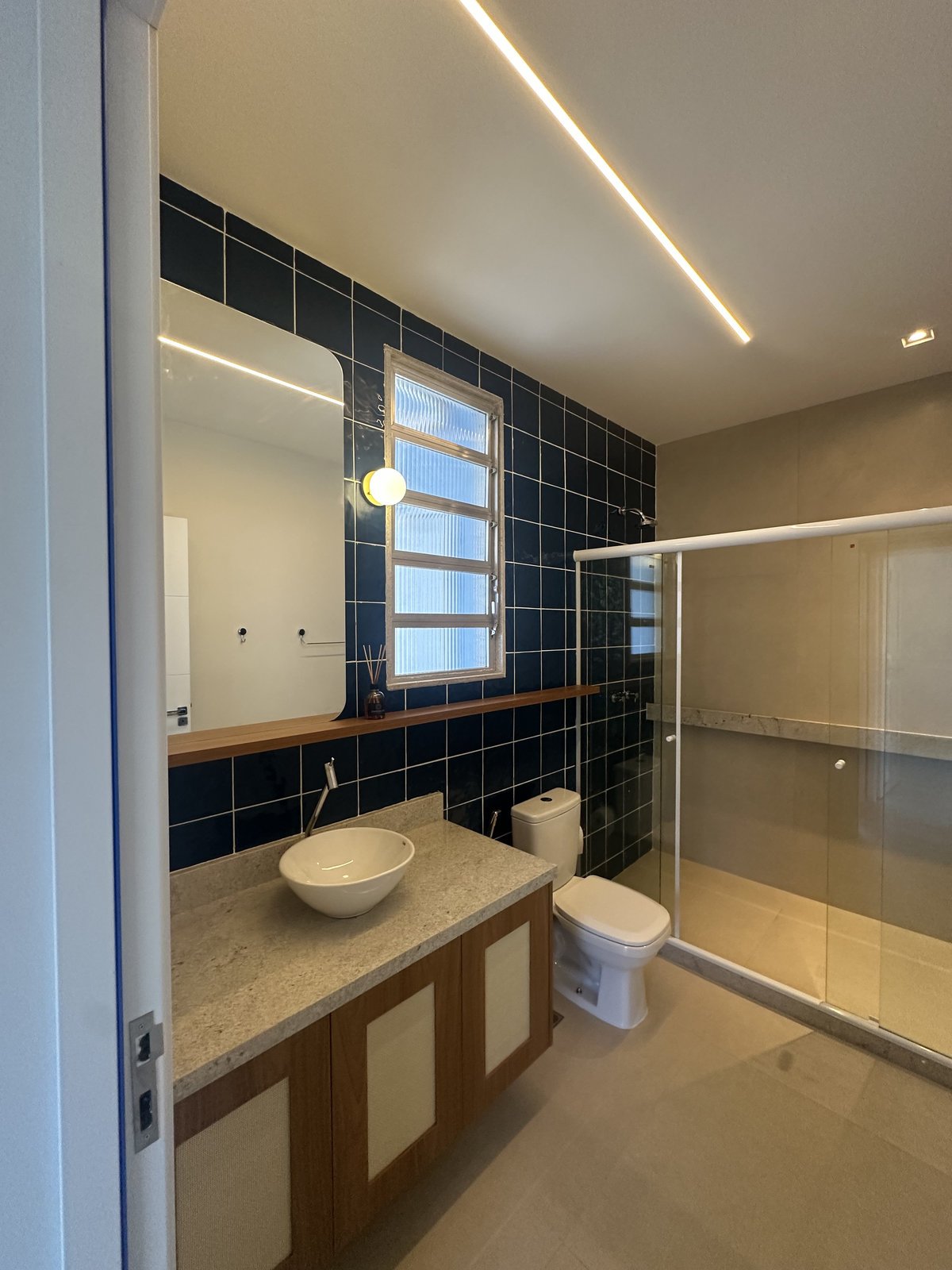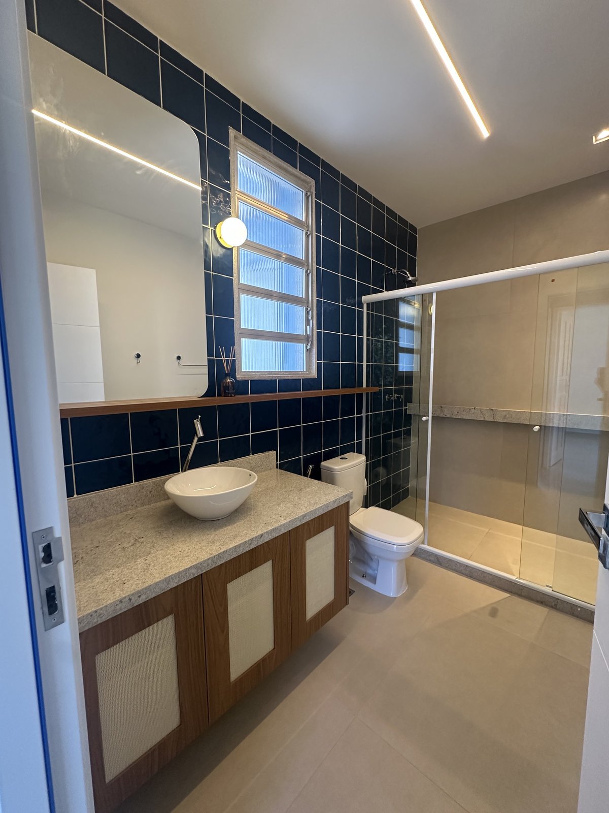 Este banheiro foi projetado para unir estilo contemporâneo e funcionalidade. O destaque fica por conta da parede em revestimento azul profundo, que cria contraste sofisticado com o piso neutro e as superfícies claras. A bancada em pedra clara, combinada à marcenaria em madeira, adiciona calor ao ambiente, equilibrando modernidade e acolhimento.
