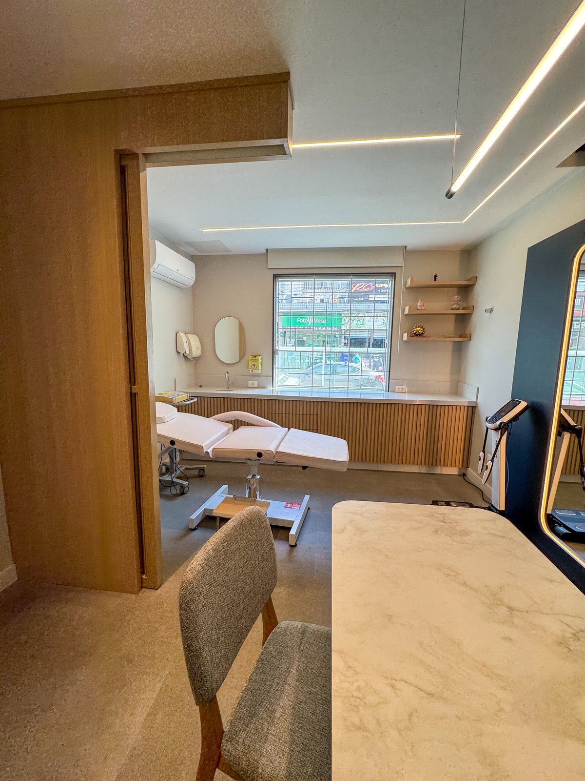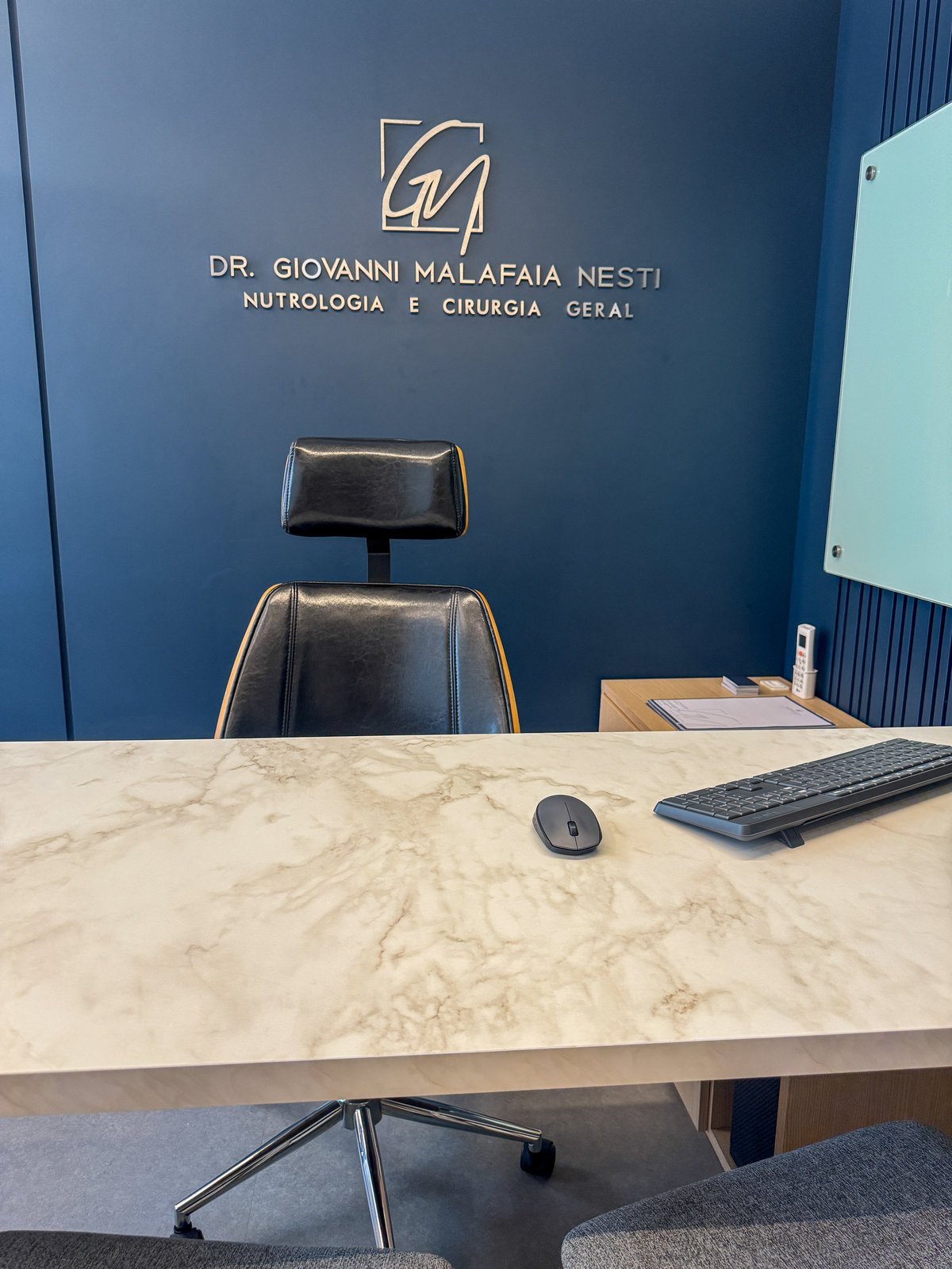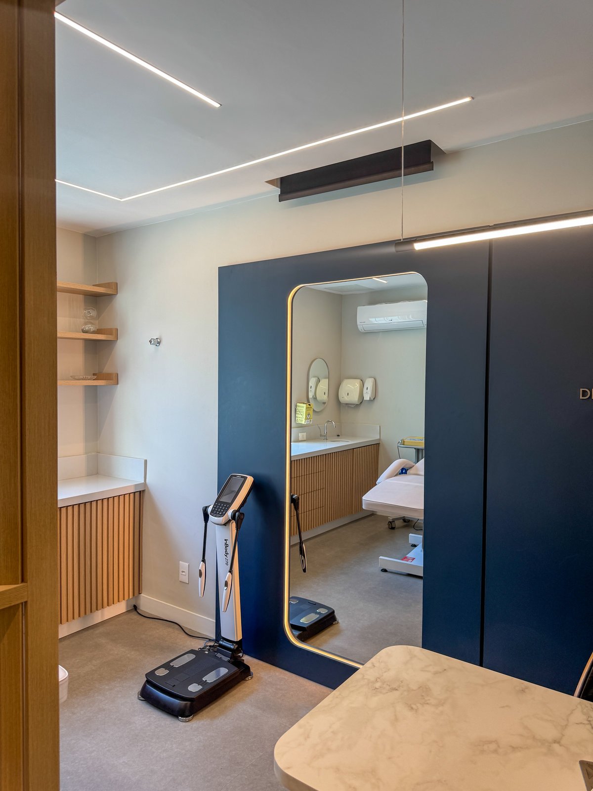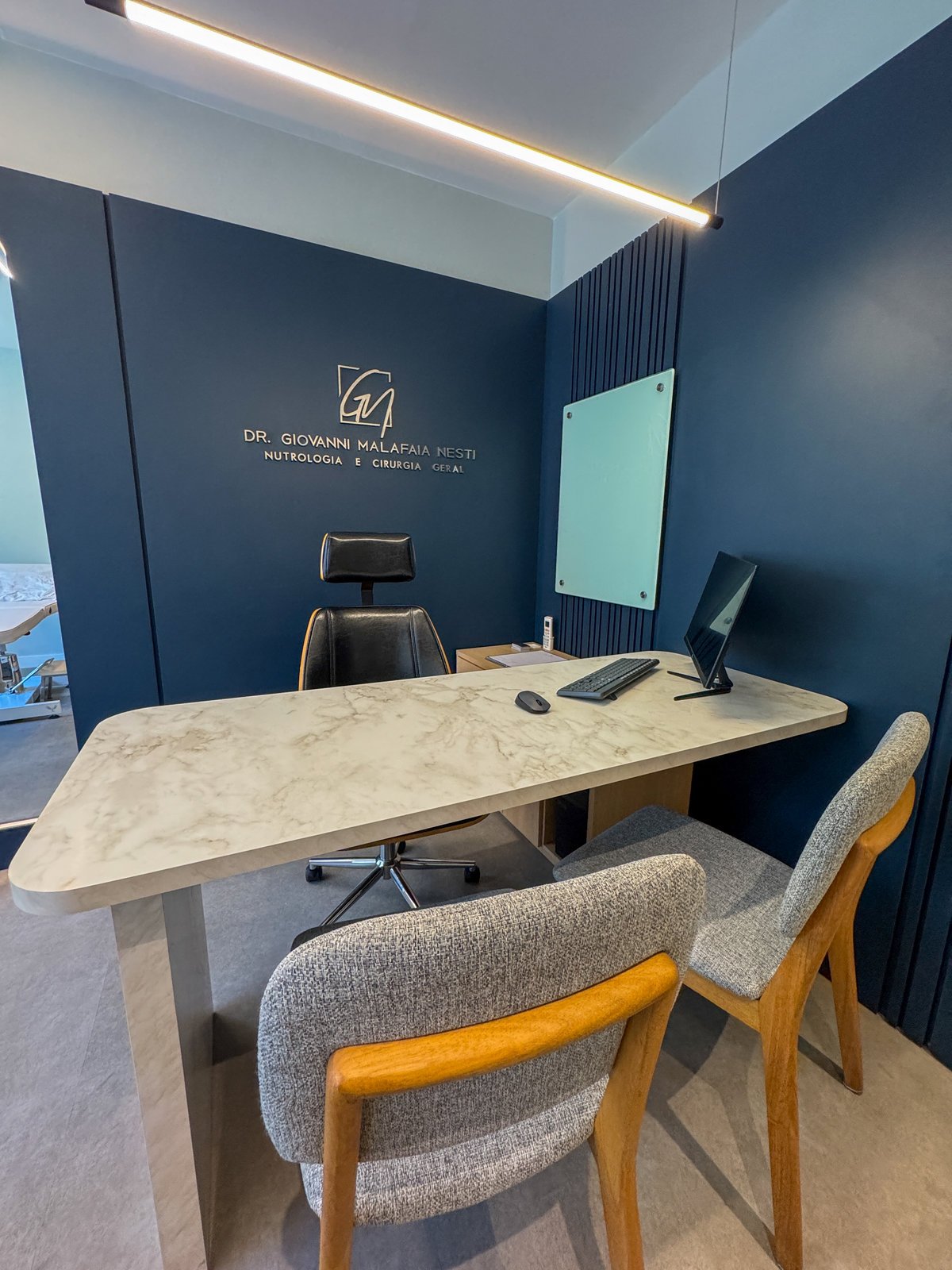 Este projeto foi desenvolvido para refletir a seriedade e a sofisticação da prática médica, sem abrir mão da acolhida e do conforto. A combinação entre painéis em azul profundo, madeira natural e superfícies em acabamento marmorizado confere ao ambiente uma estética contemporânea, limpa e elegante. O layout foi cuidadosamente planejado para garantir fluidez entre as áreas de atendimento e exame, otimizando a funcionalidade sem comprometer o bem-estar do paciente. A marcenaria sob medida e os detalhes de iluminação linear valorizam a arquitetura e criam uma atmosfera serena, ideal para consultas médicas. Cada elemento do consultório foi pensado para traduzir profissionalismo com um toque humanizado e um espaço que inspira confiança e cuidado desde o primeiro olhar.