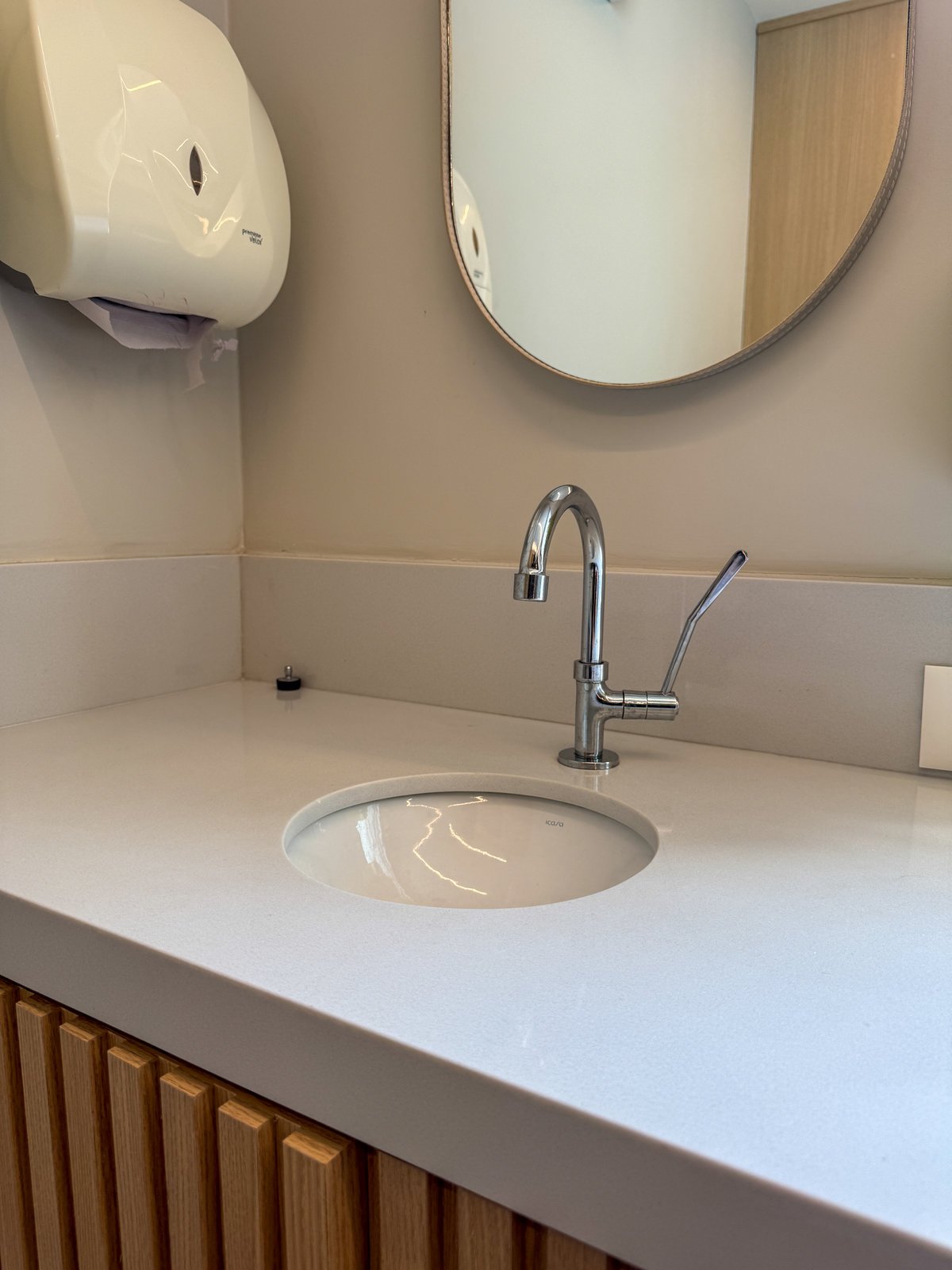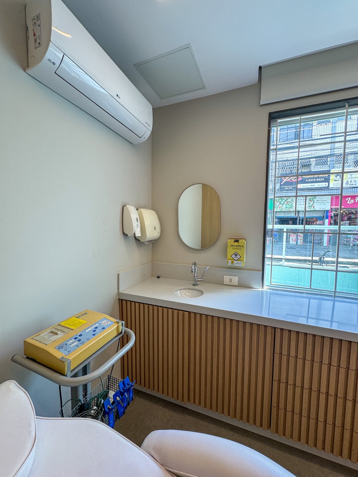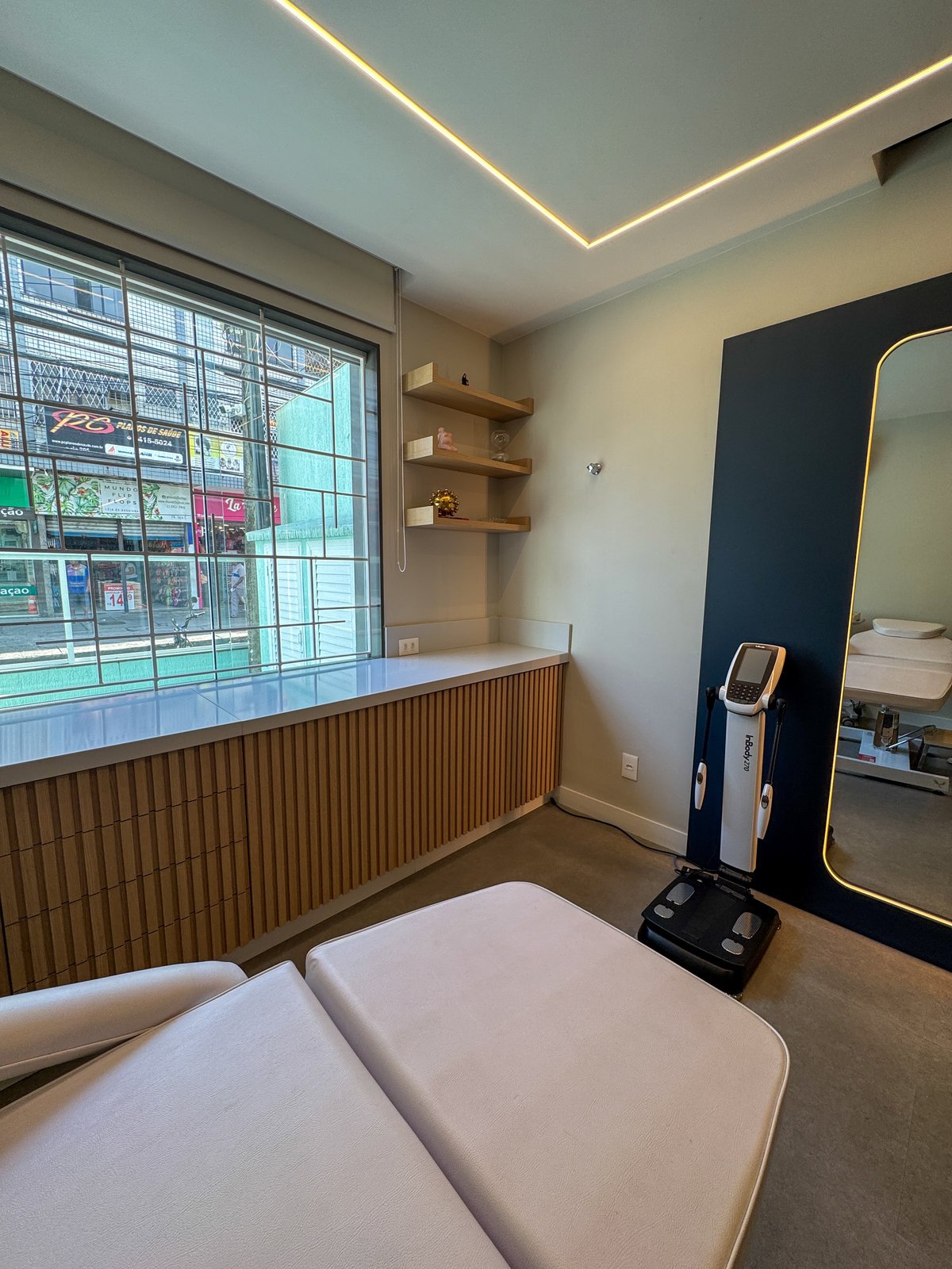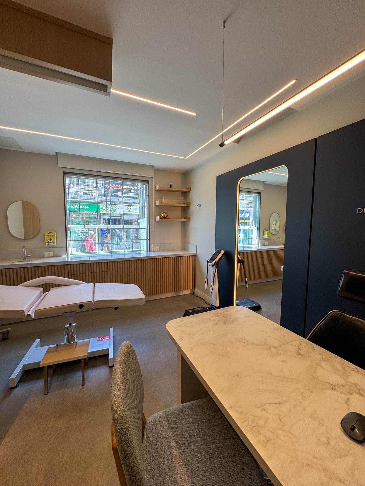 Este projeto foi desenvolvido para refletir a seriedade e a sofisticação da prática médica, sem abrir mão da acolhida e do conforto. A combinação entre painéis em azul profundo, madeira natural e superfícies em acabamento marmorizado confere ao ambiente uma estética contemporânea, limpa e elegante. O layout foi cuidadosamente planejado para garantir fluidez entre as áreas de atendimento e exame, otimizando a funcionalidade sem comprometer o bem-estar do paciente. A marcenaria sob medida e os detalhes de iluminação linear valorizam a arquitetura e criam uma atmosfera serena, ideal para consultas médicas. Cada elemento do consultório foi pensado para traduzir profissionalismo com um toque humanizado e um espaço que inspira confiança e cuidado desde o primeiro olhar.