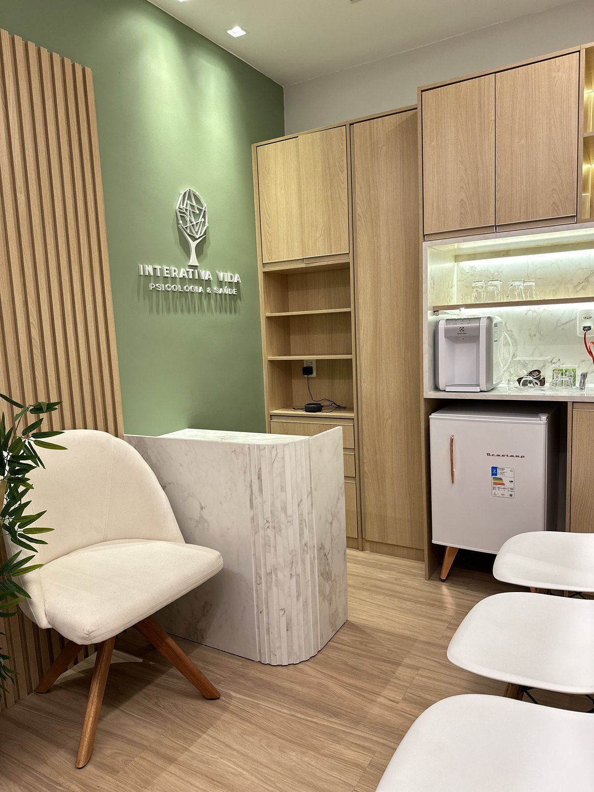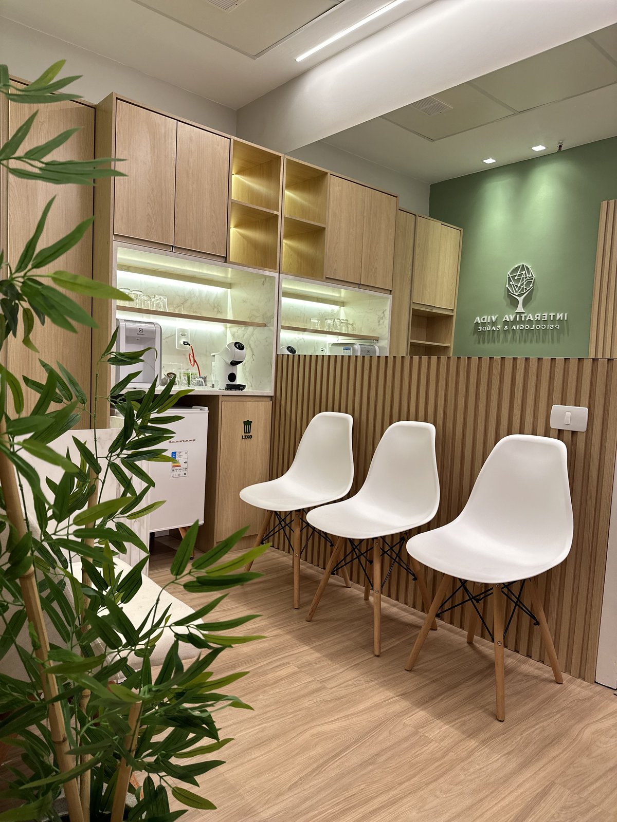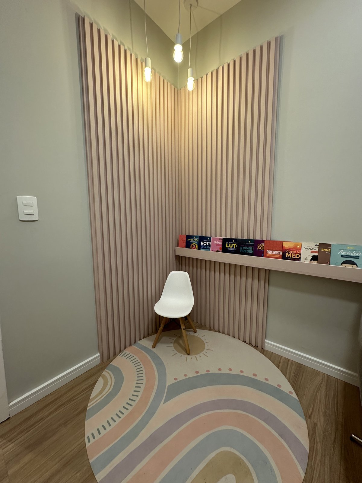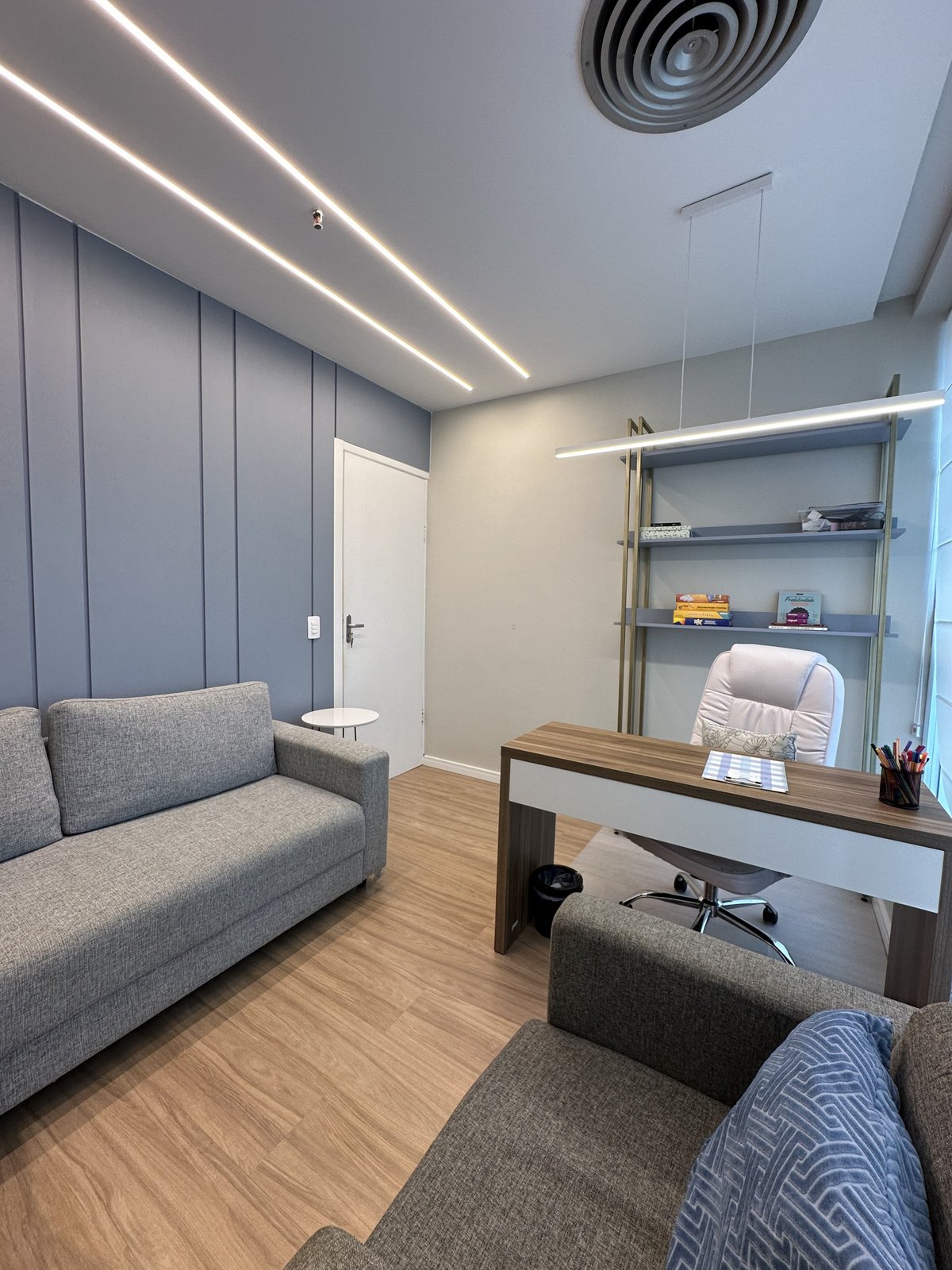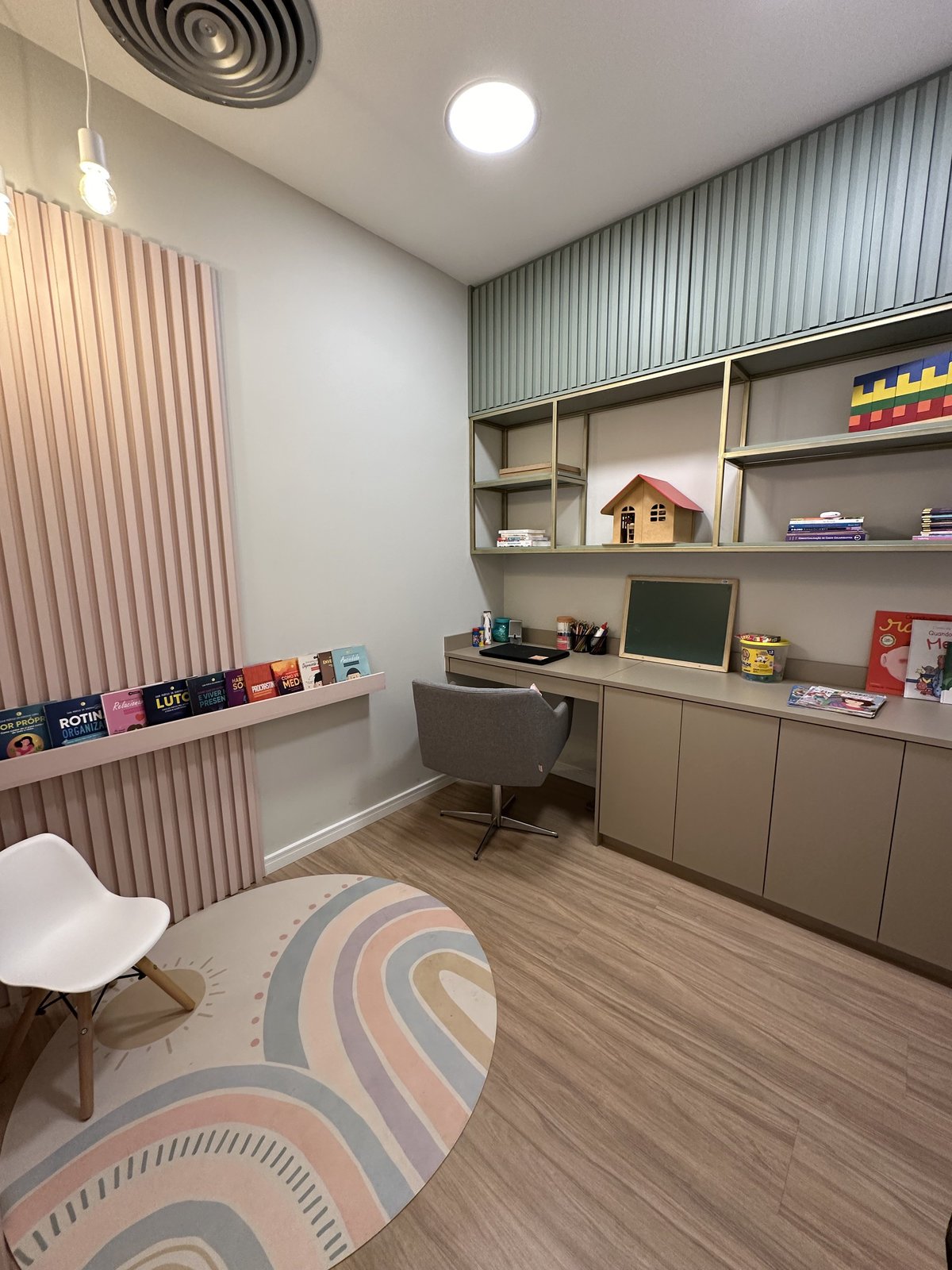 Este consultório de psicologia foi cuidadosamente projetado para oferecer um ambiente que transmite acolhimento, tranquilidade e segurança emocional. A escolha das cores suaves, a iluminação indireta e o mobiliário confortável criam uma atmosfera serena, ideal para o processo terapêutico. Cada ambiente foi pensado para facilitar o vínculo entre terapeuta epaciente, promovendo bem-estar desde a recepção até as salas de atendimento. Há também espaços adaptados para o público infantil, com elementos lúdicos e delicados que estimulam a expressão e o conforto dos pequenos.