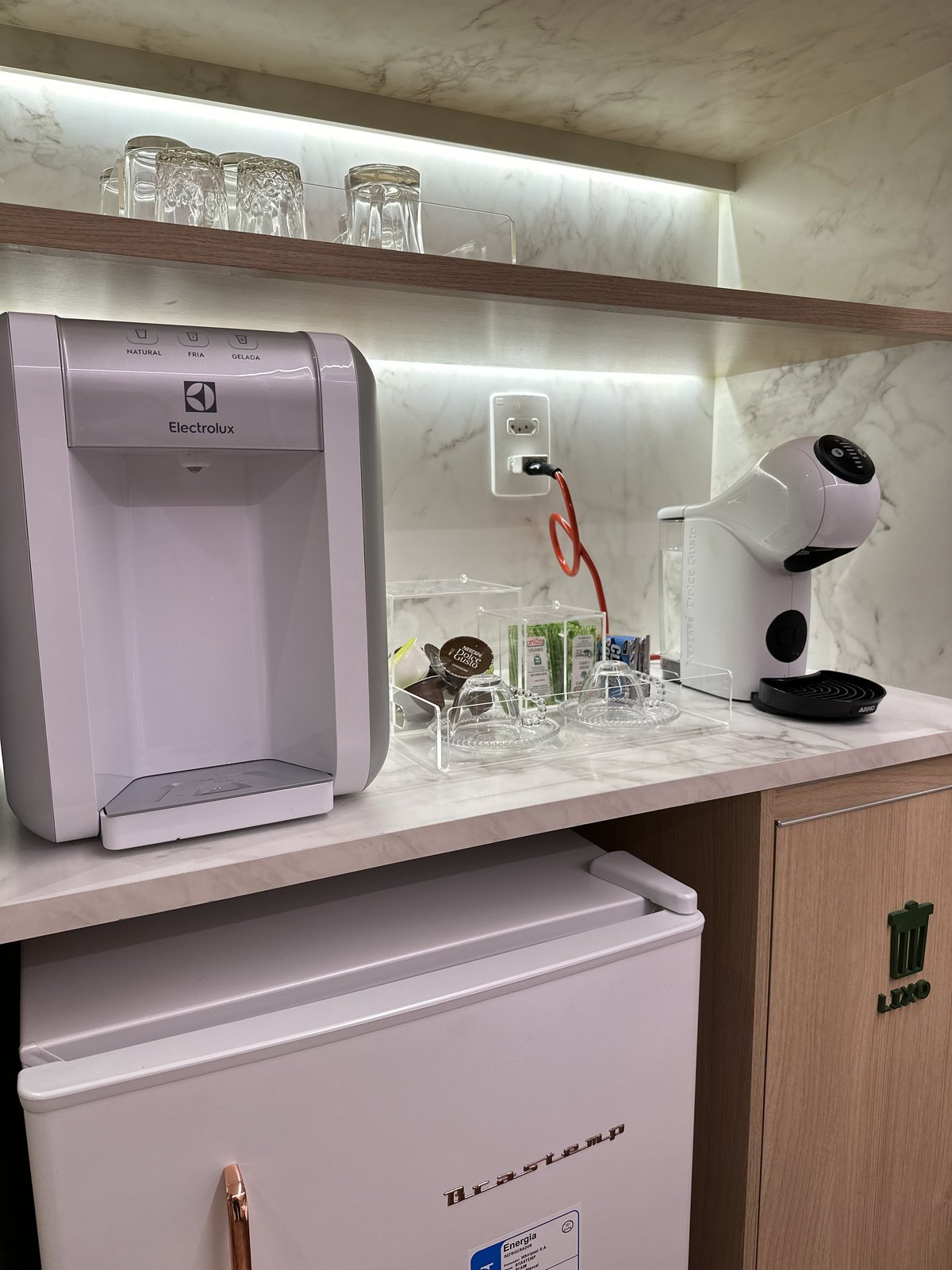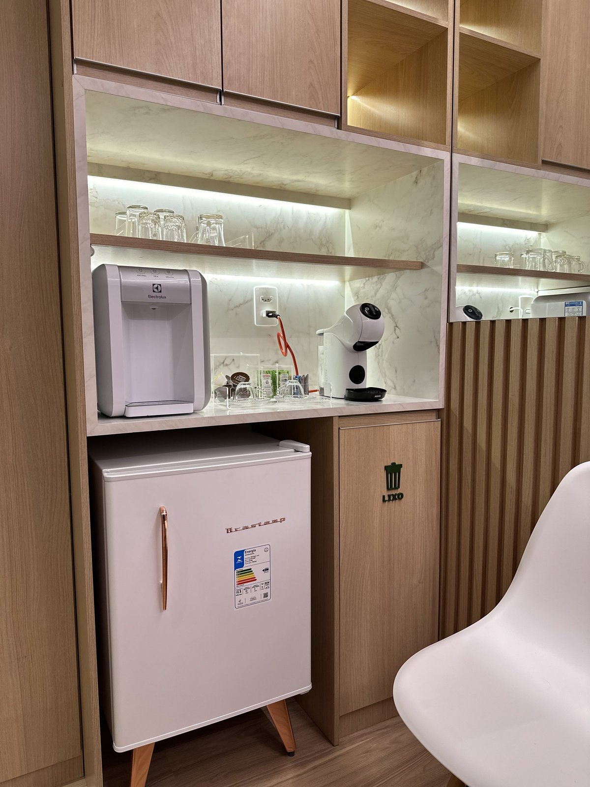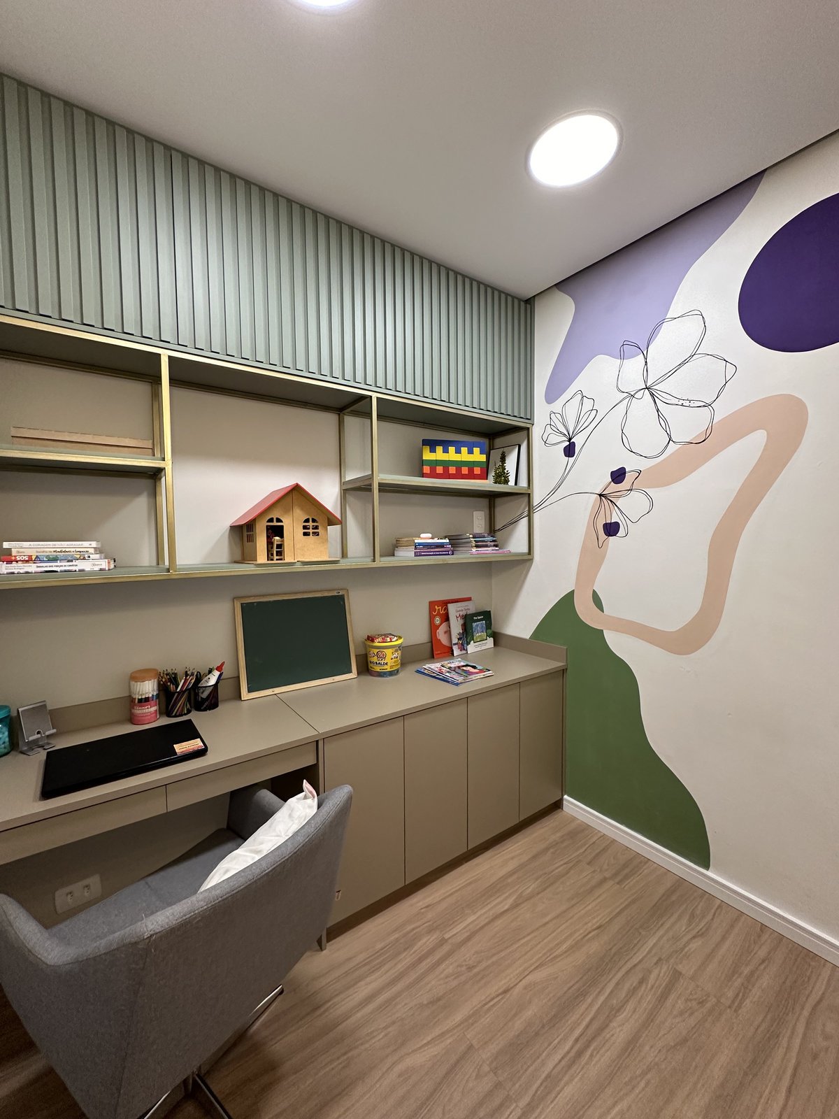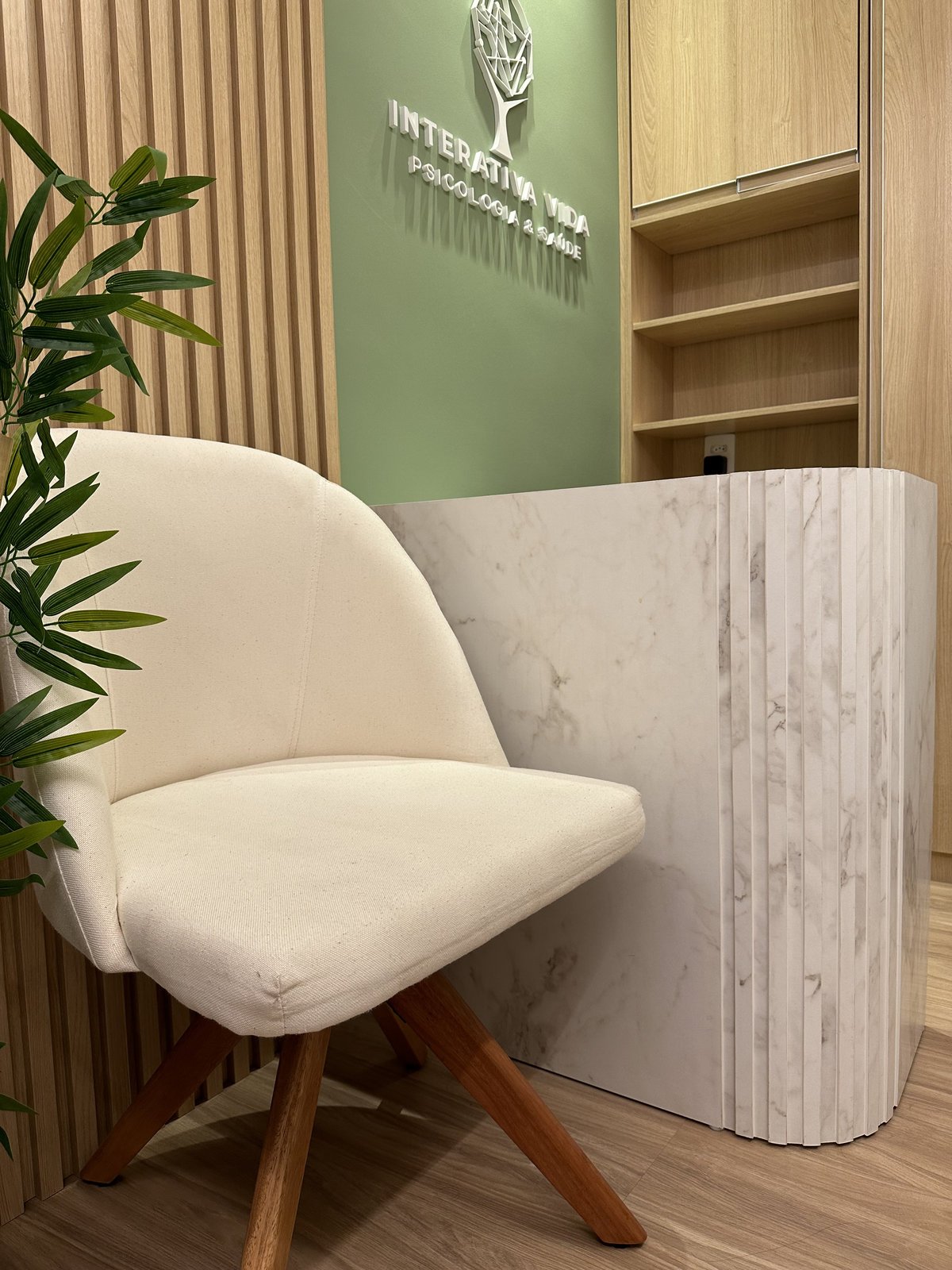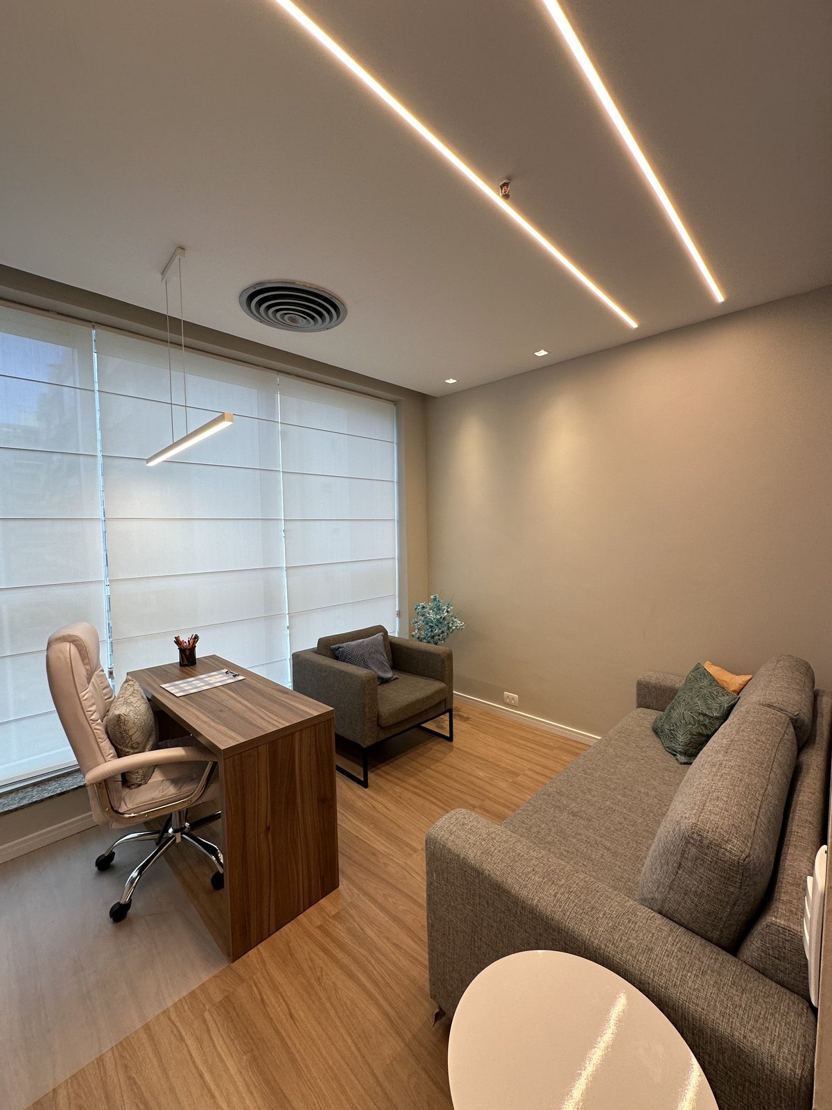 Este consultório de psicologia foi cuidadosamente projetado para oferecer um ambiente que transmite acolhimento, tranquilidade e segurança emocional. A escolha das cores suaves, a iluminação indireta e o mobiliário confortável criam uma atmosfera serena, ideal para o processo terapêutico. Cada ambiente foi pensado para facilitar o vínculo entre terapeuta epaciente, promovendo bem-estar desde a recepção até as salas de atendimento. Há também espaços adaptados para o público infantil, com elementos lúdicos e delicados que estimulam a expressão e o conforto dos pequenos.