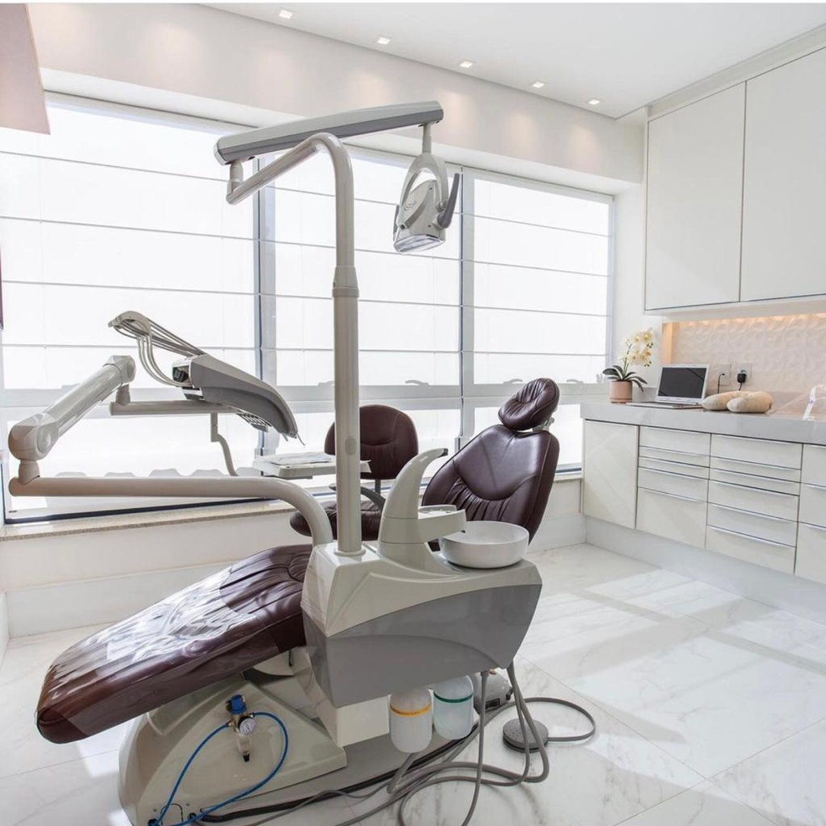 O consultório segue uma estética clean, com mobiliário em branco, revestimentos de textura leve e iluminação uniforme que valoriza o ambiente. A cadeira odontológica, posicionada diante da ampla janela filtrada por cortinas translúcidas, recebe luz natural que reforça a sensação de conforto. Nichos iluminados e superfícies amplas asseguram eficiência e praticidade no atendimento.