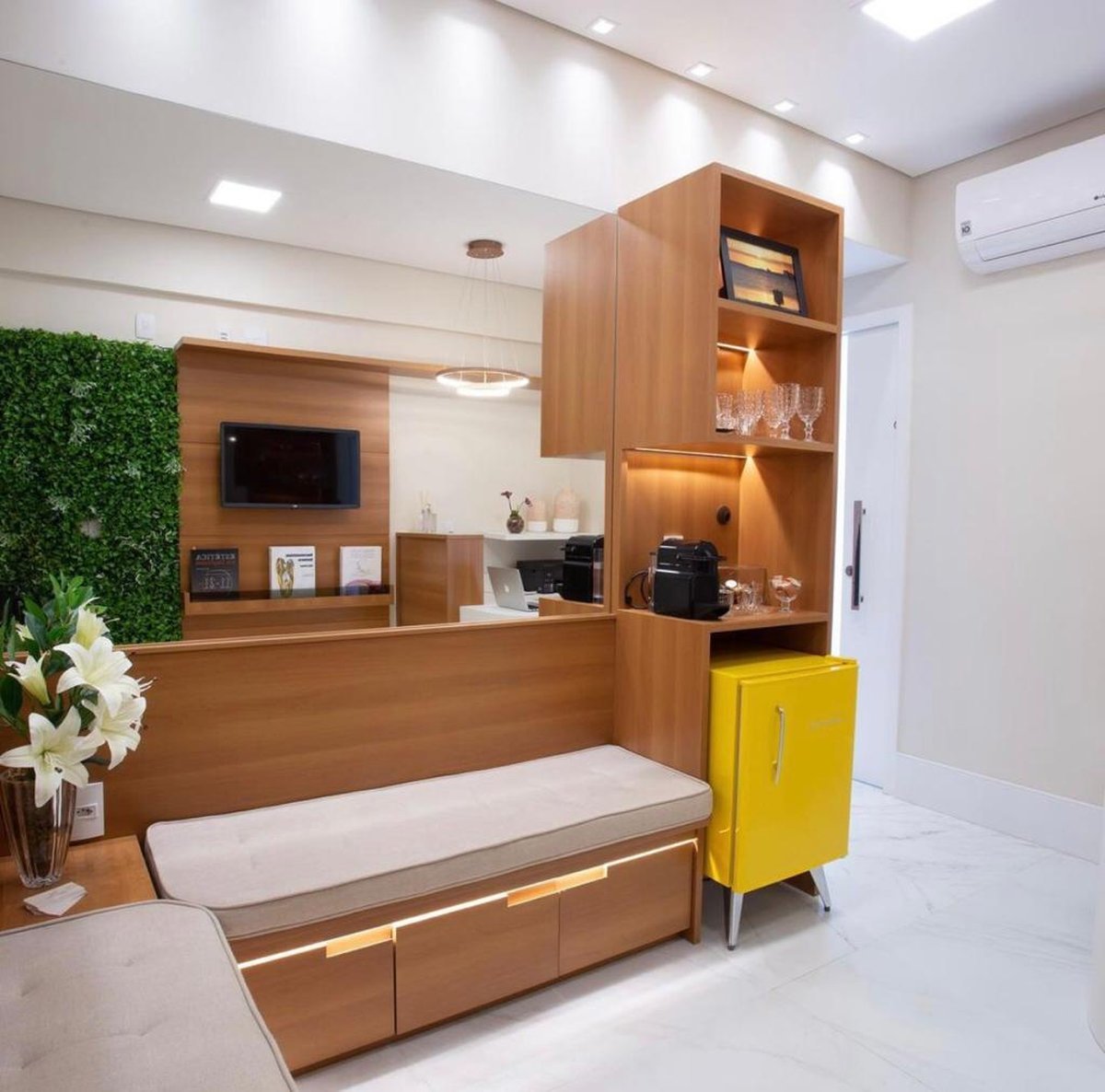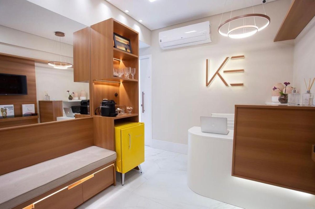 A clínica foi projetada para transmitir acolhimento e sofisticação por meio de uma paleta suave e do uso marcante da madeira. A recepção combina linhas curvas, iluminação indireta e detalhes contemporâneos, criando um ambiente convidativo e organizado. Elementos como o frigobar amarelo, o painel de madeira iluminado e a área de café garantem personalidade sem perder a elegância.