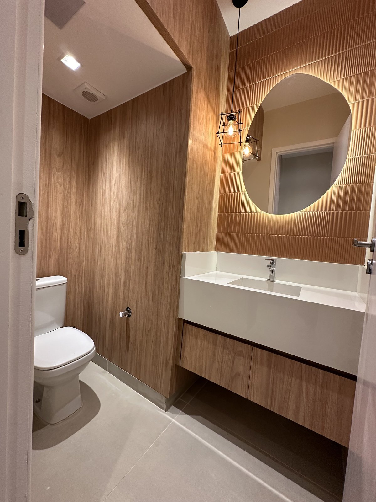 No banheiro, revestimentos texturizados e iluminação pontual reforçam o cuidado com os detalhes. Cada ambiente foi pensado para unir estética, conforto e eficiência, resultando em uma clínica contemporânea e acolhedora.
