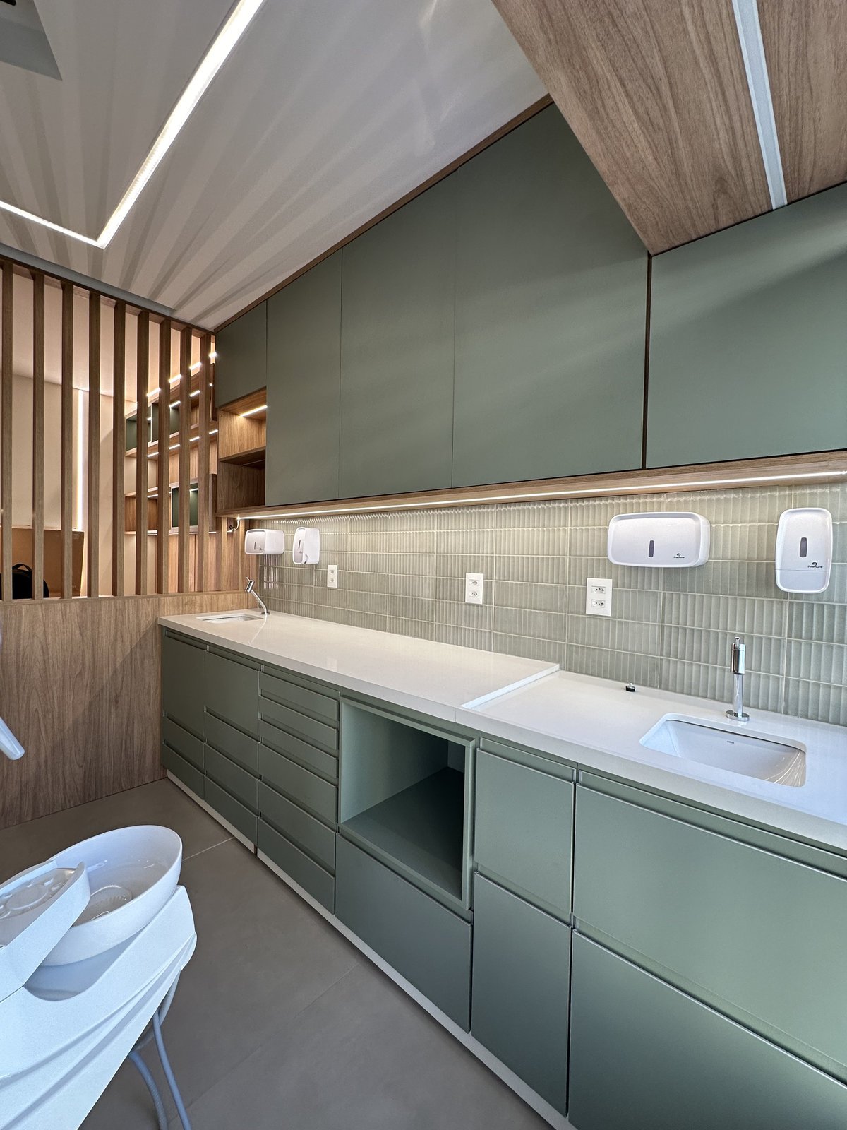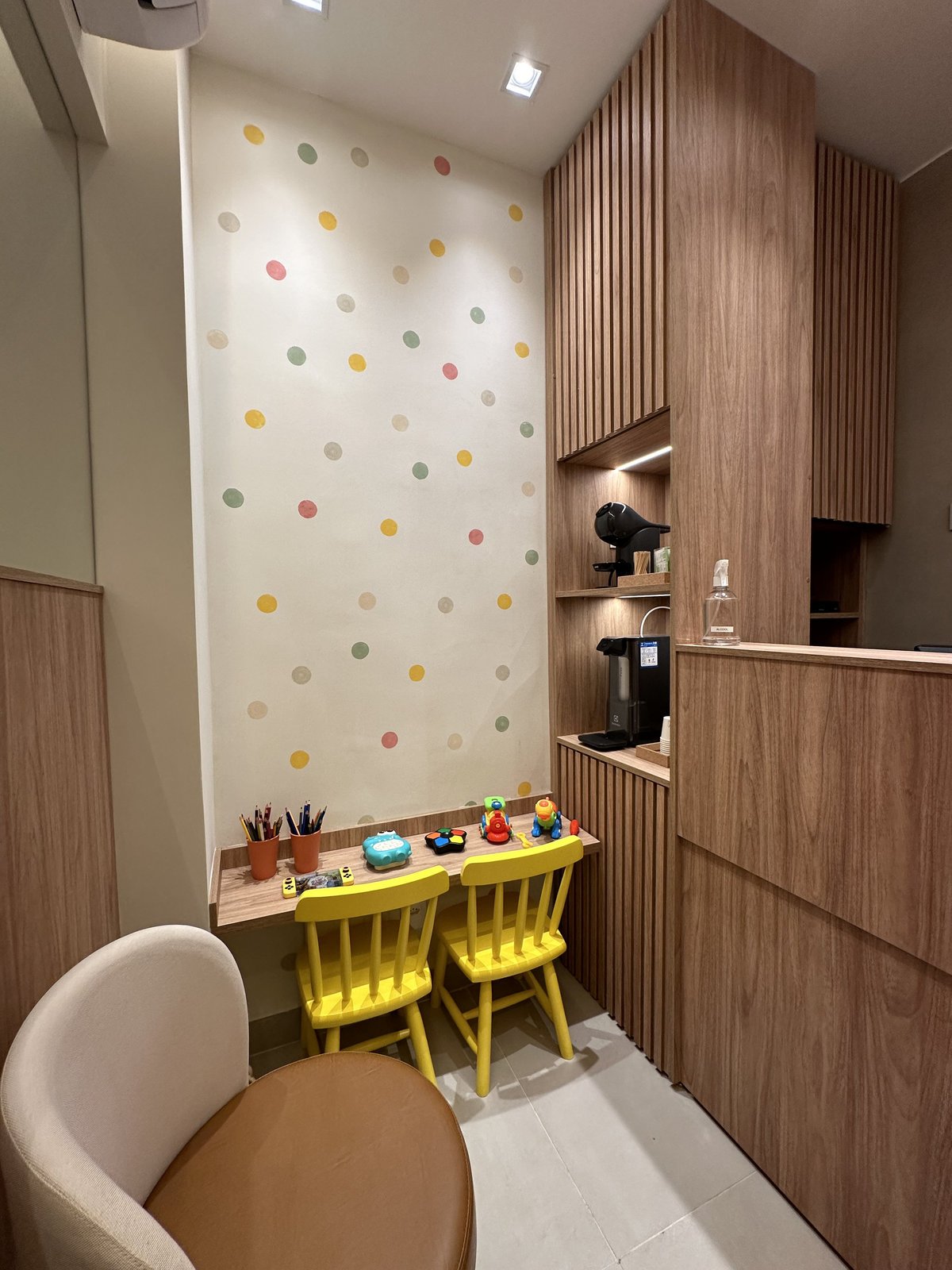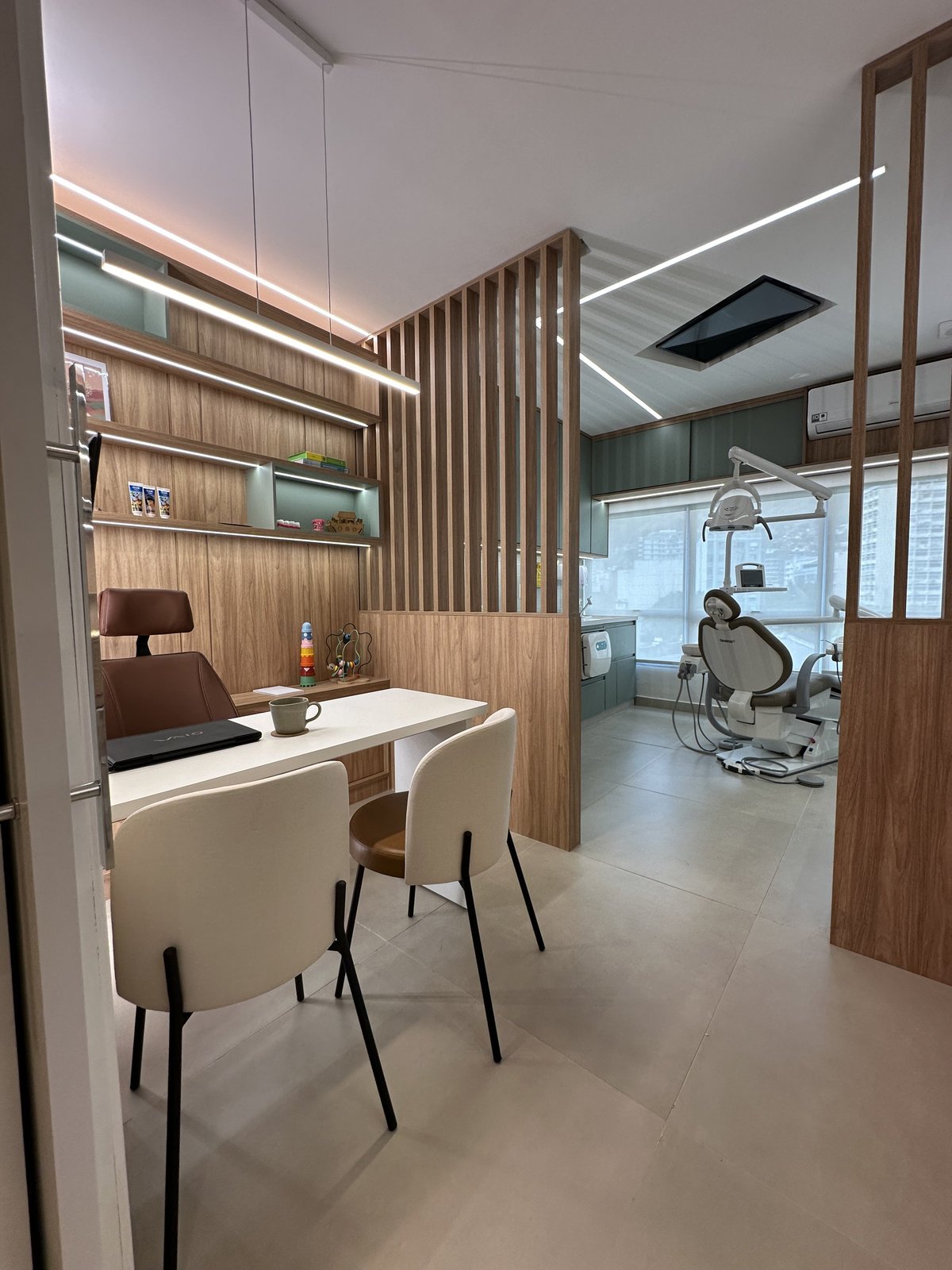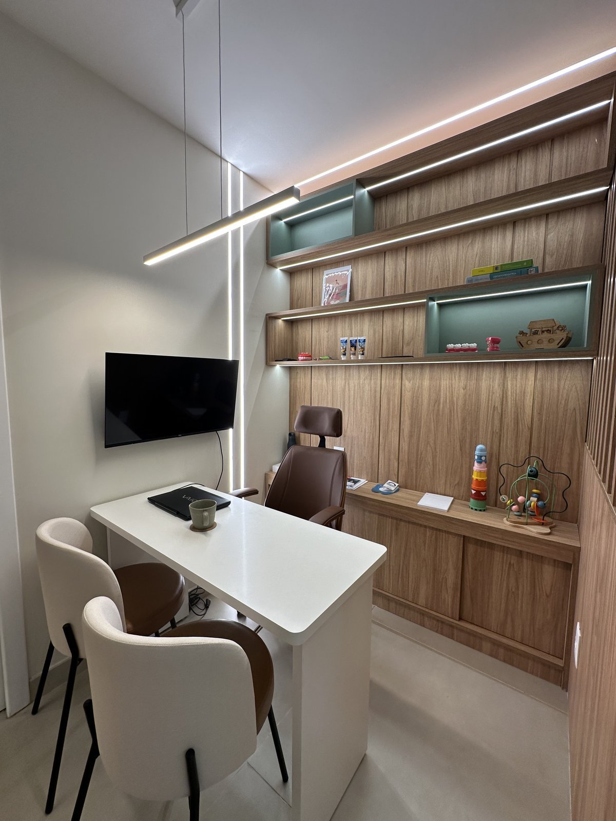 O consultório conta com bancadas amplas e armários planejados, garantindo praticidade e organização no dia a dia clínico. Um espaço infantil foi incluído para tornar a experiência mais leve para as crianças, mantendo a identidade elegante do conjunto.